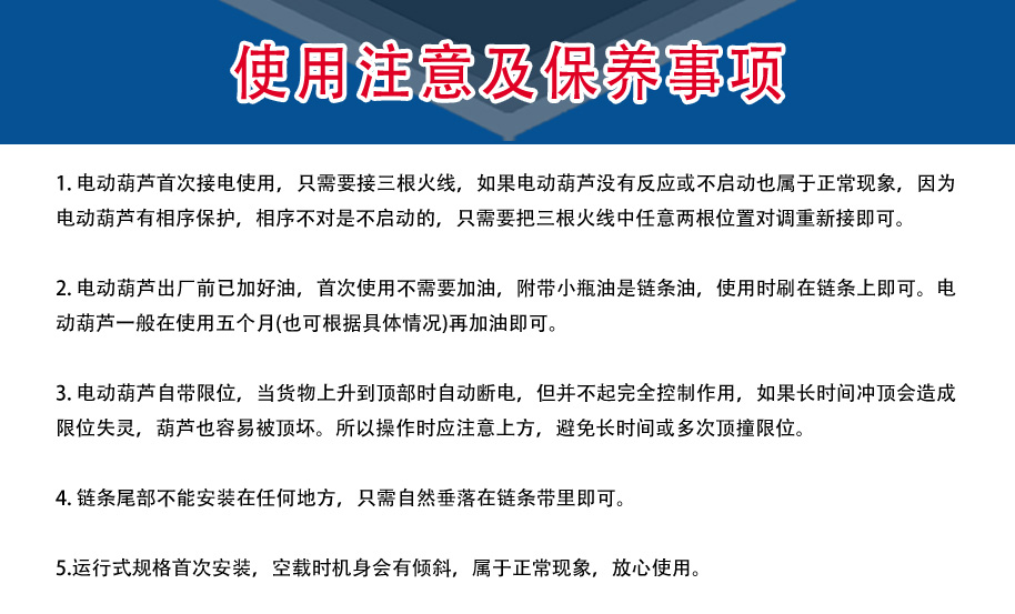 电动环链葫芦可以安装在悬挂的工字梁,柔性导轨,悬臂群吊导轨和固定提升点上。电动葫芦结构紧凑,电机轴线垂直于卷筒轴线的电动葫芦采用蜗轮传动装置。其缺点为:长度尺寸大,宽度方面尺寸大,结构粗笨,机械效率低,加工较难等。液压系统为双重控制,溢流调节阀、磁接点压力表均可对压力进行****的控制。电器控制部门采用了低电压控制,增加了支配系统的安全性。它也可以在低层建筑物和不适合架设桥式群吊的地方以及电动葫芦中运输。电动葫芦结构紧凑,电机轴线垂直于卷筒轴线的电动葫芦采用蜗轮传动装置。其缺点为:长度尺寸大,宽度方面尺寸大,结构粗笨,机械效率低,加工较难等。液压系统为双重控制,溢流调节阀、磁接点压力表均可对压力进行****的控制。电器控制部门采用了低电压控制,增加了支配系统的安全性。在大的地方使用。电动环链葫芦的操作,操作和关闭如下:启动操作:接通电源,打开控制电源;吊重物前试运行链式电动葫芦。环链电动葫芦操作过程中的操作及注意事项:起吊重物不得超过群吊规定的重量;操作过程中严禁在重物下站立或行走;不得超载;制动带不得有油污;设备起吊状态下不得有安全防护措施..起吊物品下方严禁任何部位;吊链应垂直悬挂使用,吊链倾斜度应保持在链条与铅线夹角不大于10-15°范围内,双排链条不得翻扭..当链条直径减少原有直径的10%时,应更换新链条。当链的塑性伸长率达到5%时,必须更换链条。链条生锈严重,不得连续使用;严格遵守起吊安全操作规程,严禁使用易燃易爆物品;机器不宜载人,也不宜起吊因飞溅引起的腐蚀性物品;起吊时,下吊钩不得与机体接触,二者不得小于50 mm。电动环链葫芦的关闭操作:在提升完成后,将搅拌电机的一部分放置在支撑框架上。严禁长时间处于吊装状态;停车后,拔掉电源插头。