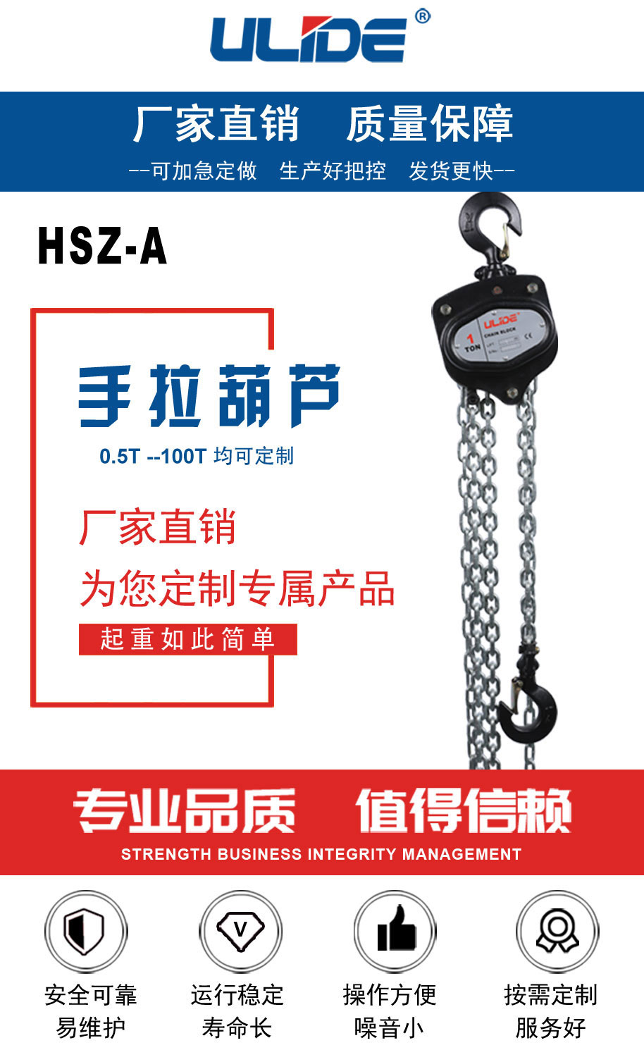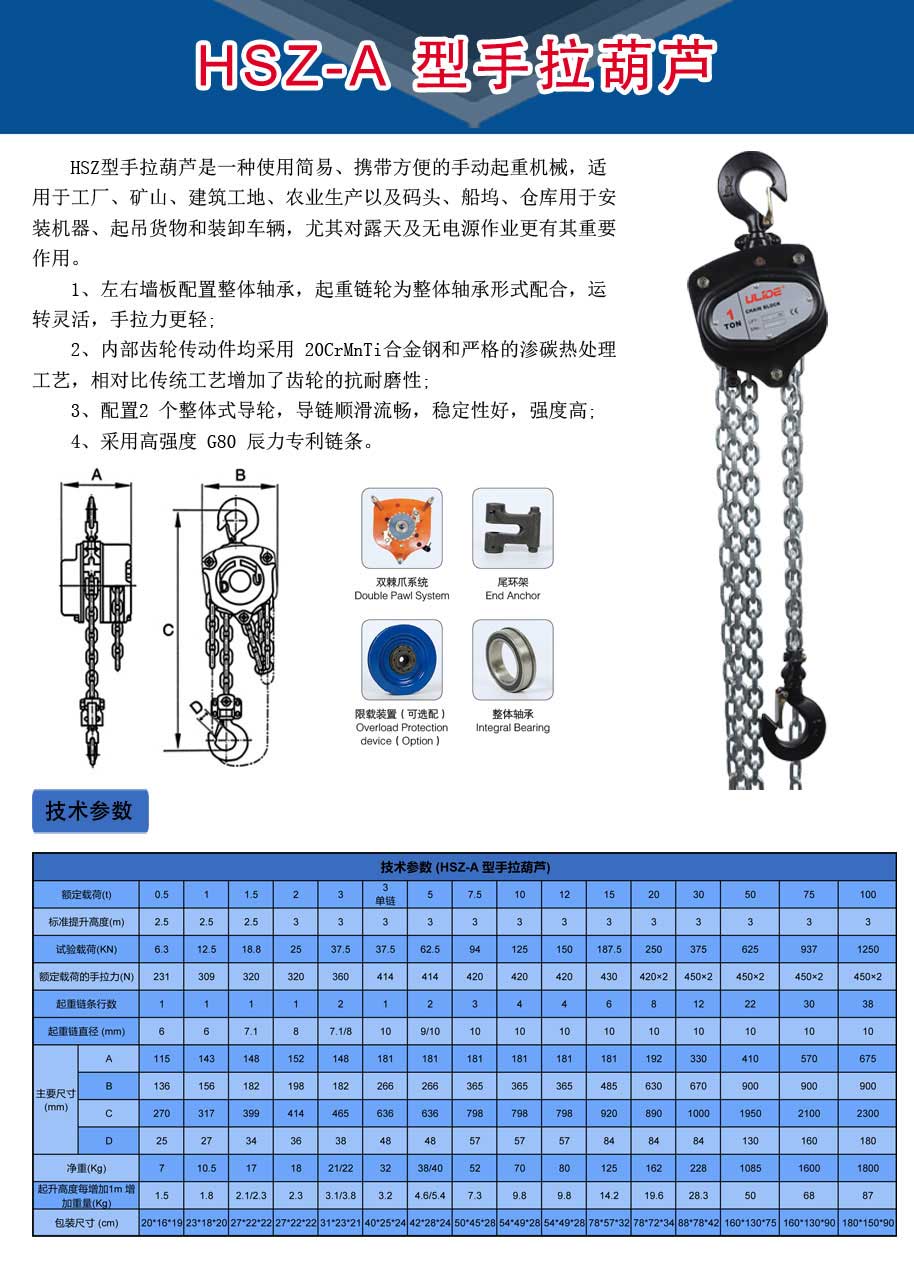 手拉葫芦的外壳材质是合金钢,坚固耐磨,安全性能高。手拉葫芦向上提升重物时,顺时针拽动手动链条、手链轮转动,下降时逆时针拽动手拉链条,制动座跟刹车片分离,棘轮在棘爪的作用下静止,五齿长轴带动起重链轮反方向运行,从而平稳下降重物。手拉葫芦具有安全可靠、维护简便、机械效率高、手链拉力小、自重较轻便于携带、外形美观尺寸较小、经久耐用的特点。优力德公司手拉葫芦最小可以做到250公斤,zuida可以做到100t.
