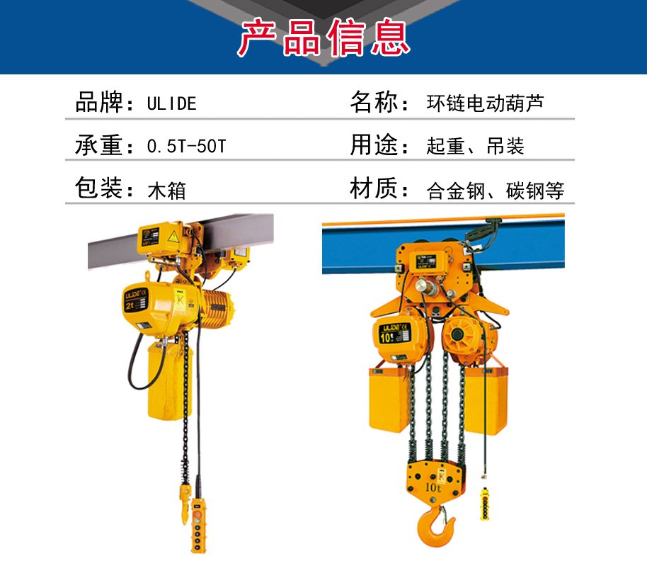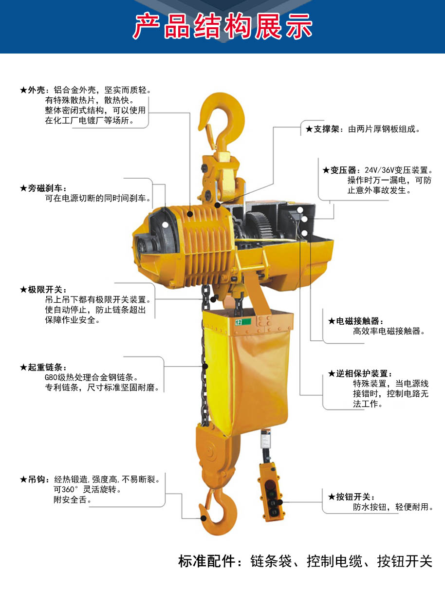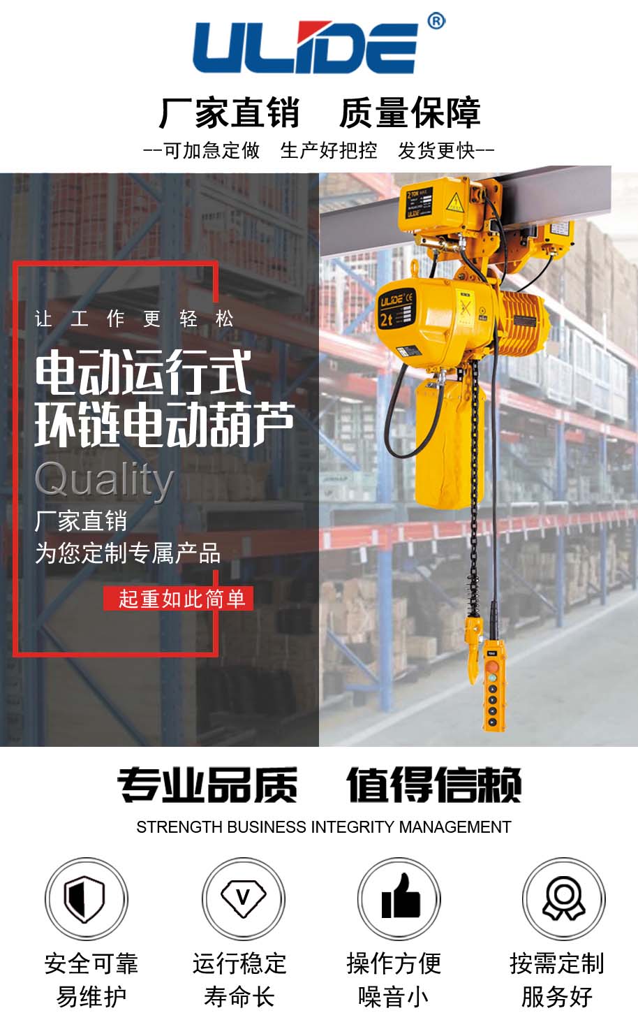 环链电动葫芦是一种轻小型起重设备,具有结构紧凑、重量轻、体积小、零部件通用性强、操作方便等优点。电动葫芦可广泛用于提升重物或安装在单梁起重机,直线、曲线的工字梁上,也可用于葫芦双梁、葫芦龙 门起重机或悬臂吊上,是工矿企业、铁路、码头、仓库中常用的起重设备。