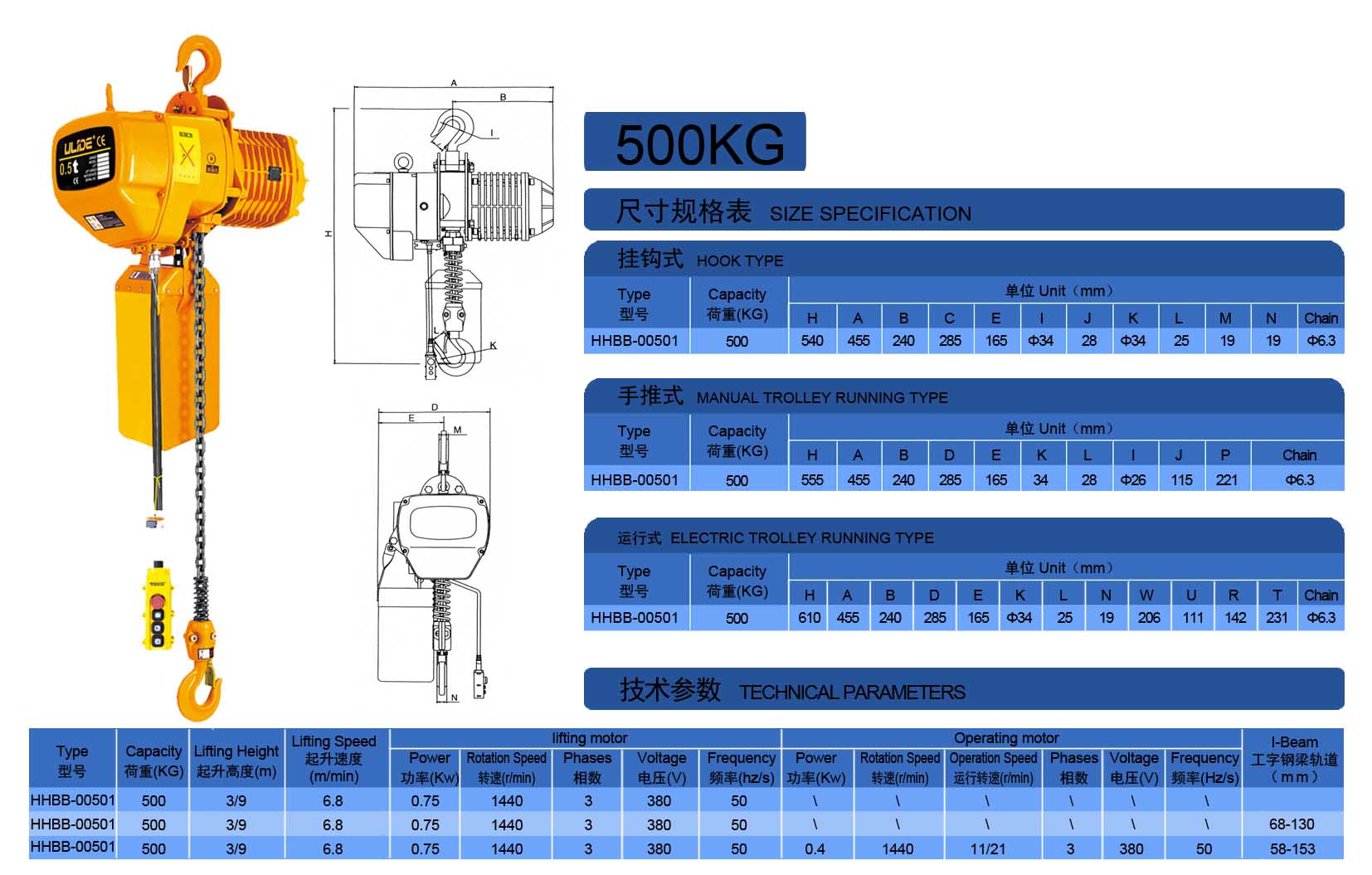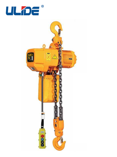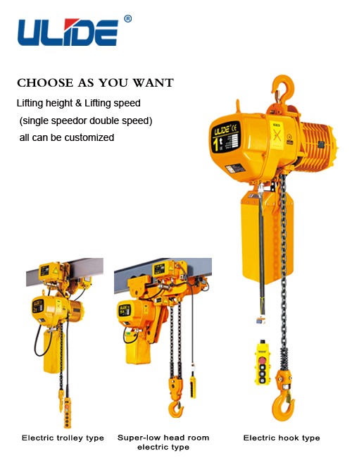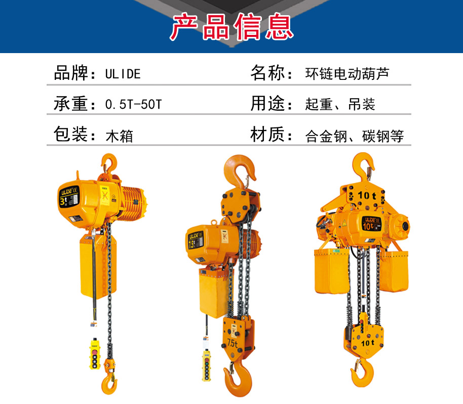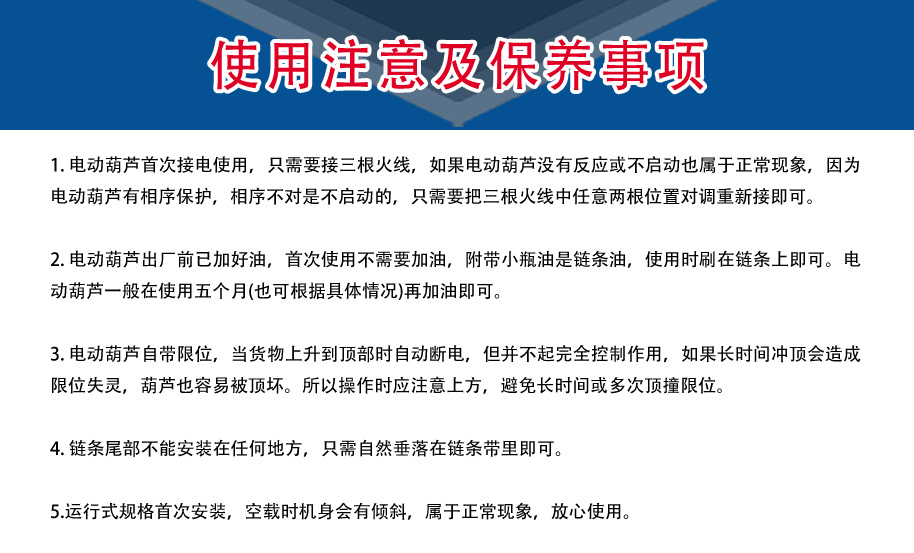 3. 极限开关:重物吊上吊下都有极限开关装置,使电机自动停止,以防链条超